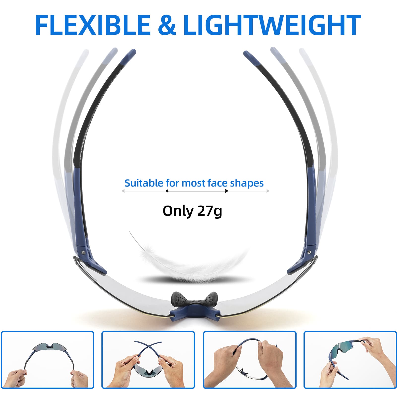 • Kehyksetön muotoilu. ROCKBROS-urheiluaurinkolasien leveät linssit tarjoavat laajemman näkökentän ja varmistavat, että näkökenttäsi on esteetön.