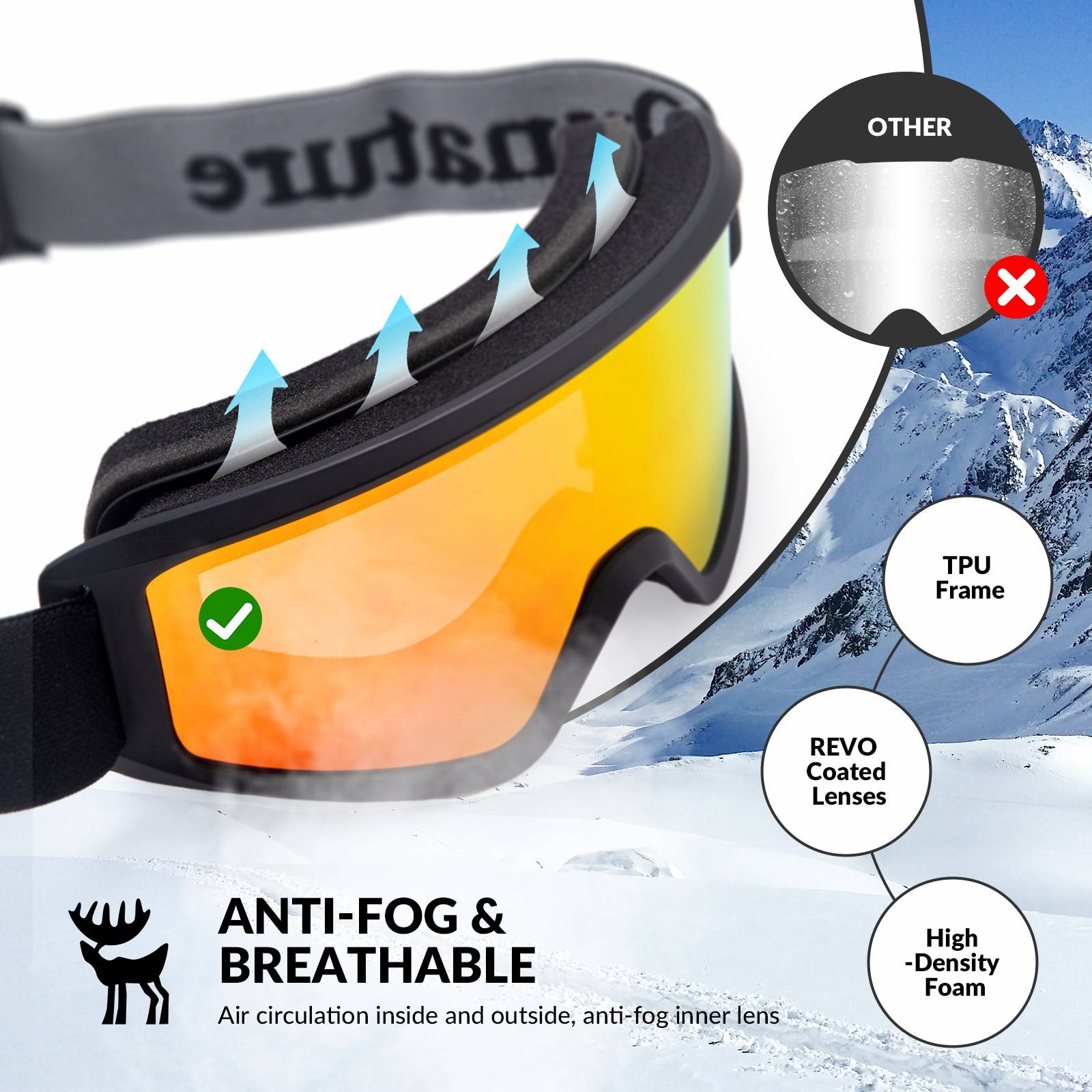 Quantute huurtumattomat laskettelulasit tuplalinssillä – Kirkas näkö ilman huurtumista, mukavat ja turvalliset. Kolmessa värissä hiihtoon, lumilautailuun ja talviurheiluun.