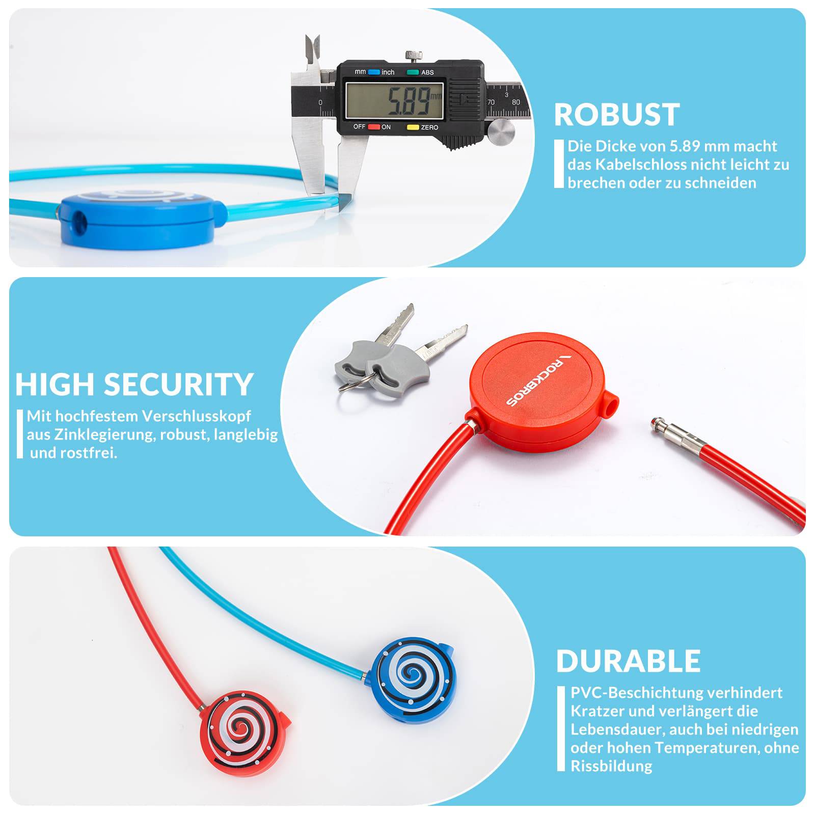 • Korkea turvallisuus:Tämä polkupyörän vaijerilukko on valmistettu erittäin lujasta teräslangasta, mikä takaa vahvan viillonkestävyyden, mikä vaikeuttaa leikkaamista ja tarjoaa paremman suojan polkupyörällesi. Kirkkaanväriset vaijerit helpottavat tunnistamista.
