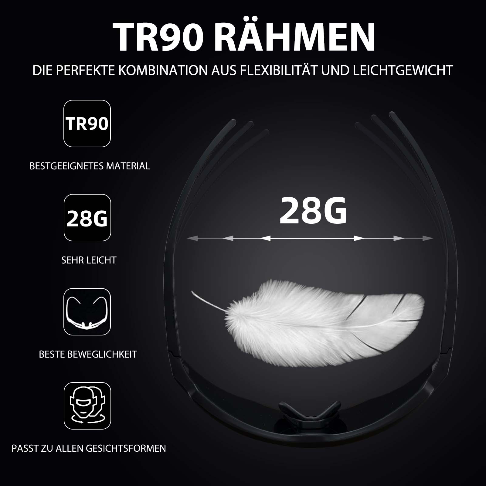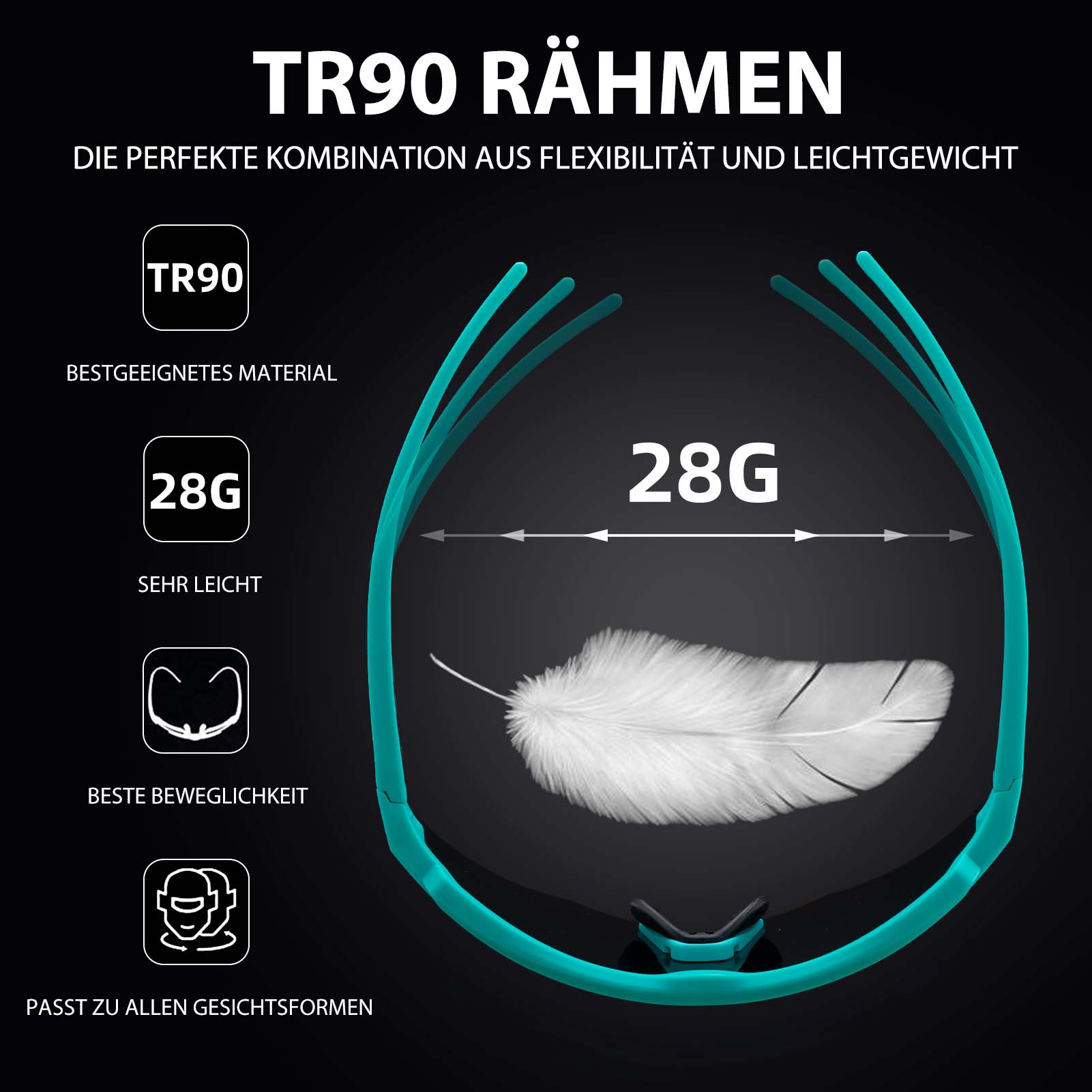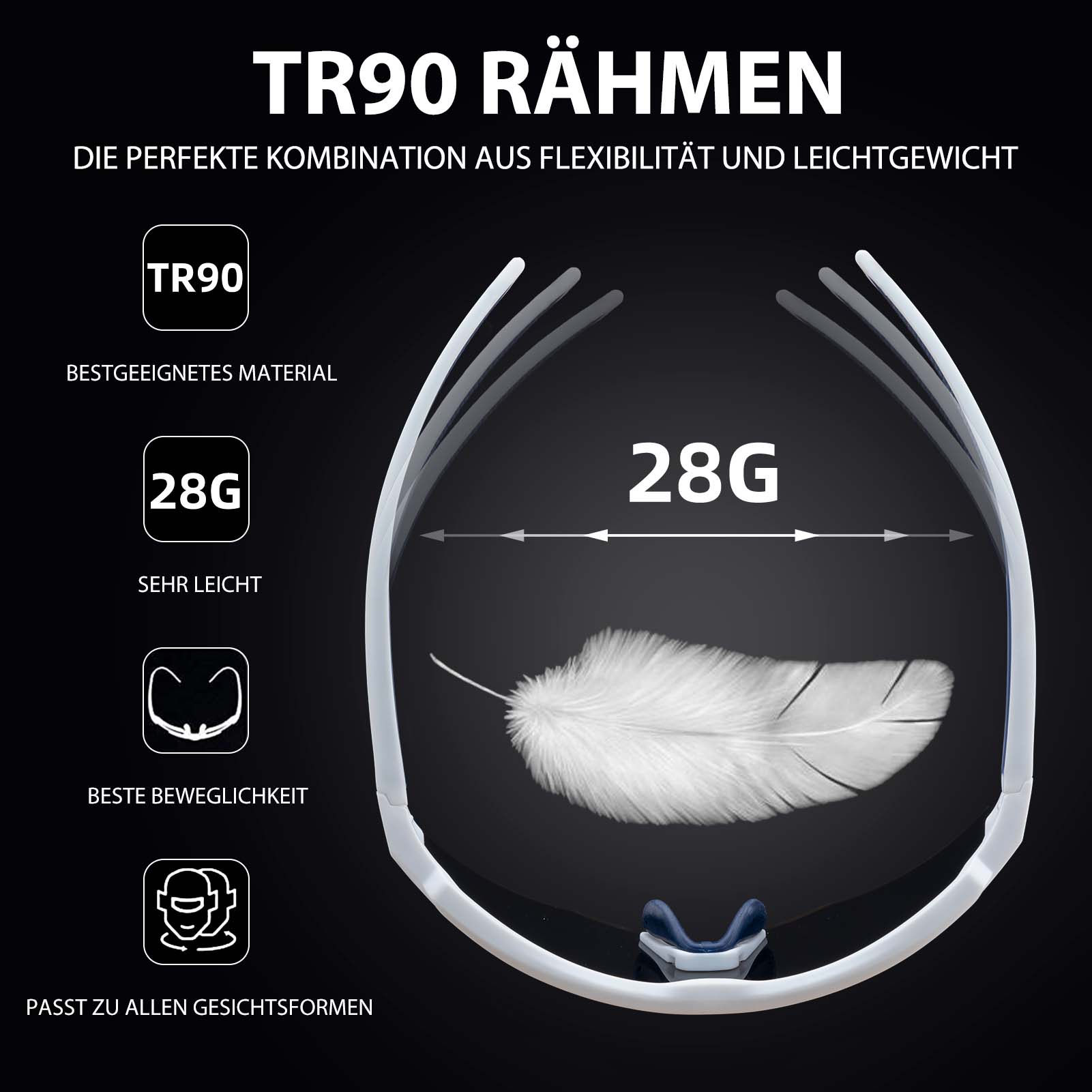 • Kevyet ja mukavat: Näissä urheiluaurinkolaseissa on kevyet TR-kehykset. Säädettävät nenätyynyt lisäävät mukavuutta.