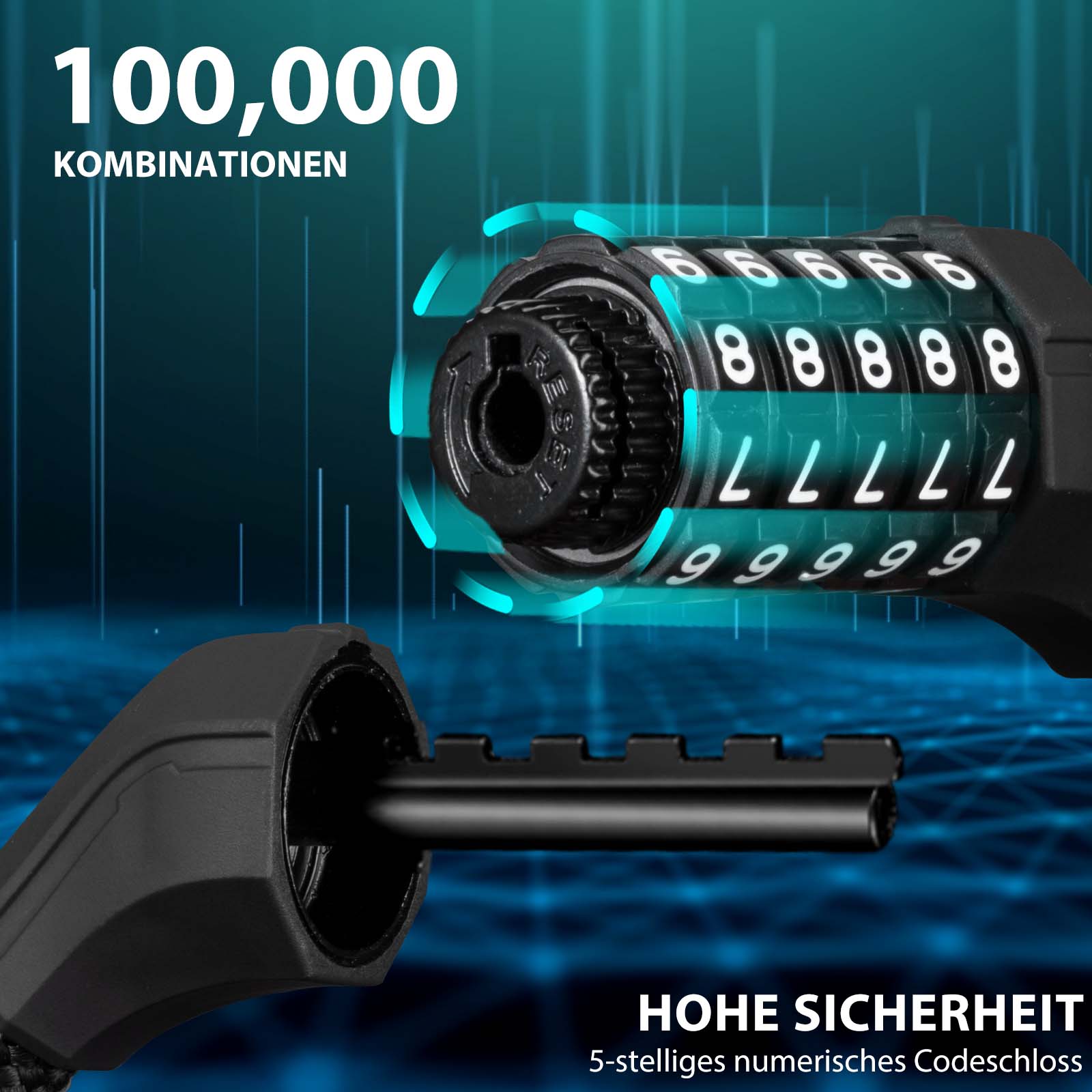 • 5-numeroinen salasana: 5-numeroisella koodillaan (yhteensä 100 000 mahdollista yhdistelmää) polkupyörän lukko tarjoaa erinomaisen varkaussuojan. Älä huoli, ettet pysty avaamaan lukkoa kadonneen avaimen vuoksi.