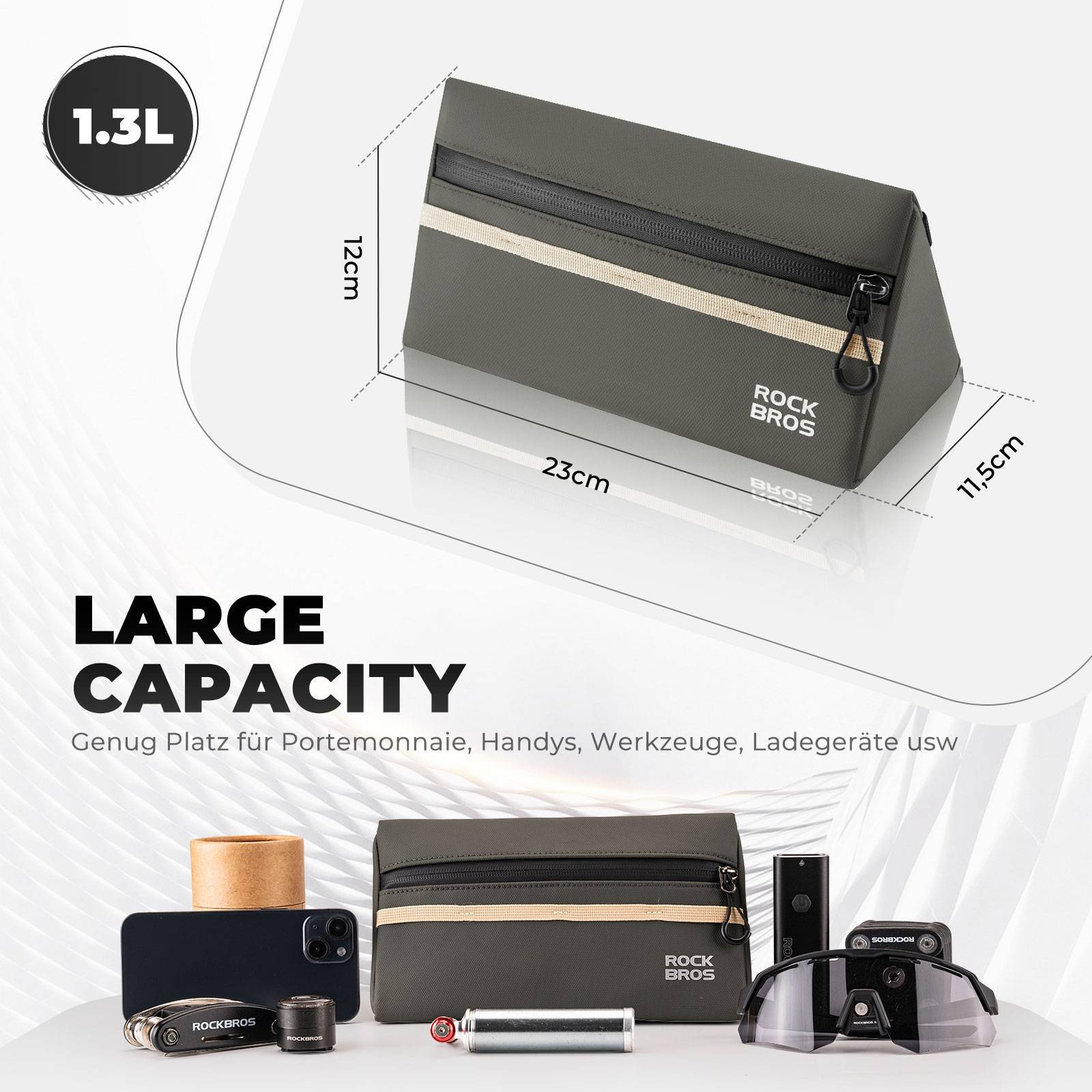 Noin 23 cm x 12 cm x 11,5 cm, tilavuus 1,3 litraa. Polkupyörän ohjaustankolaukkuun mahtuu helposti esimerkiksi matkapuhelimia, varavirtalähteitä, korjaustyökaluja, lompakoita, energiapatukoita jne. Polkupyörän ohjaustankolaukku täyttää päivittäiset tarpeesi.