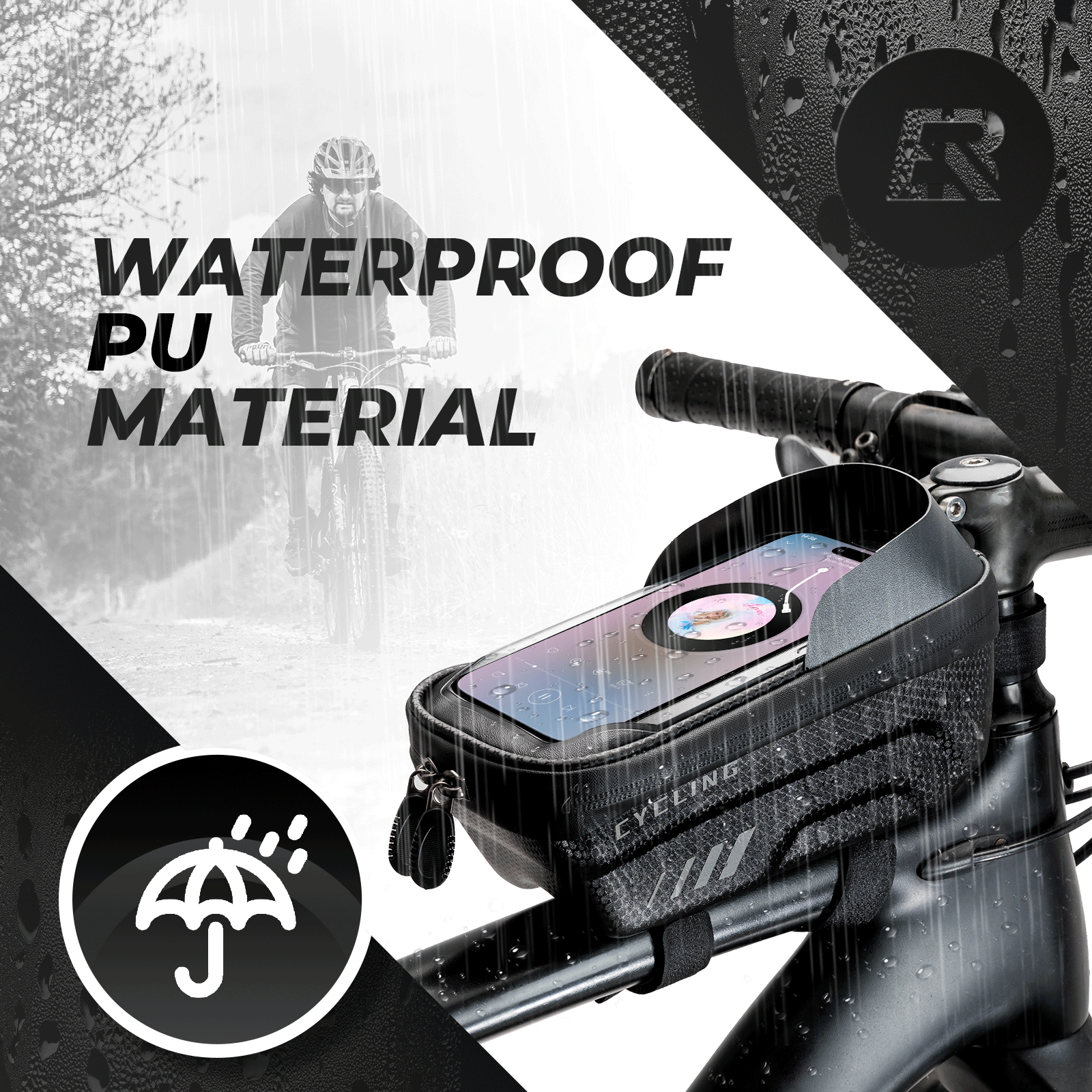 Mukavampaa pyöräilyä: Polkupyörän yläputken laukussa on kuulokeliitäntä musiikin kuuntelua varten. Aurinkoviiri estää heijastuksia ja mahdollistaa näytön helpon näkemisen. Puhelintaskussa on paksu vaahtomuovipehmuste, joka suojaa puhelintasi iskuilta.