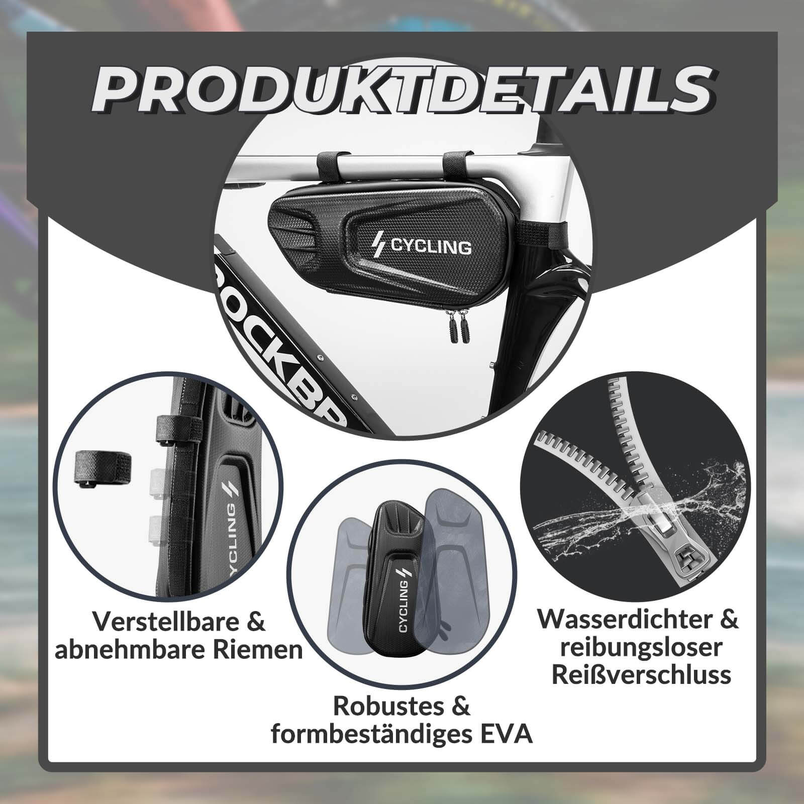 ROCKBROS polkupyörän runkolaukut on valmistettu vedenpitävästä EVA-materiaalista. Vedenpitävät vetoketjut parantavat vedenpitävyyttä. Kolmionmuotoinen laukkumme ei kuitenkaan ole 100 % vedenpitävä. Älä aja pitkiä aikoja sateessa äläkä upota tätä laukkua veteen.