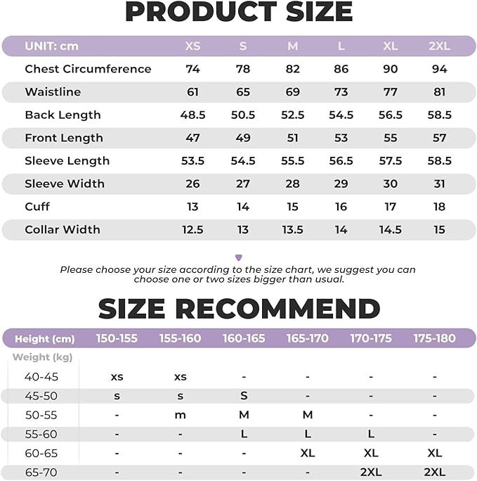 KÄYTÄNNÖLLINEN: Tämä naisten urheilutakki sopii pyöräilyyn, juoksuun, koripalloon, tennikseen, kuntoiluun, joogaan ja muihin sisä- ja ulkourheilulajeihin. Lisätiedot: Saatavana 5 kokoa: S, M, L, XL, XXL.