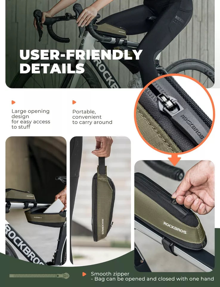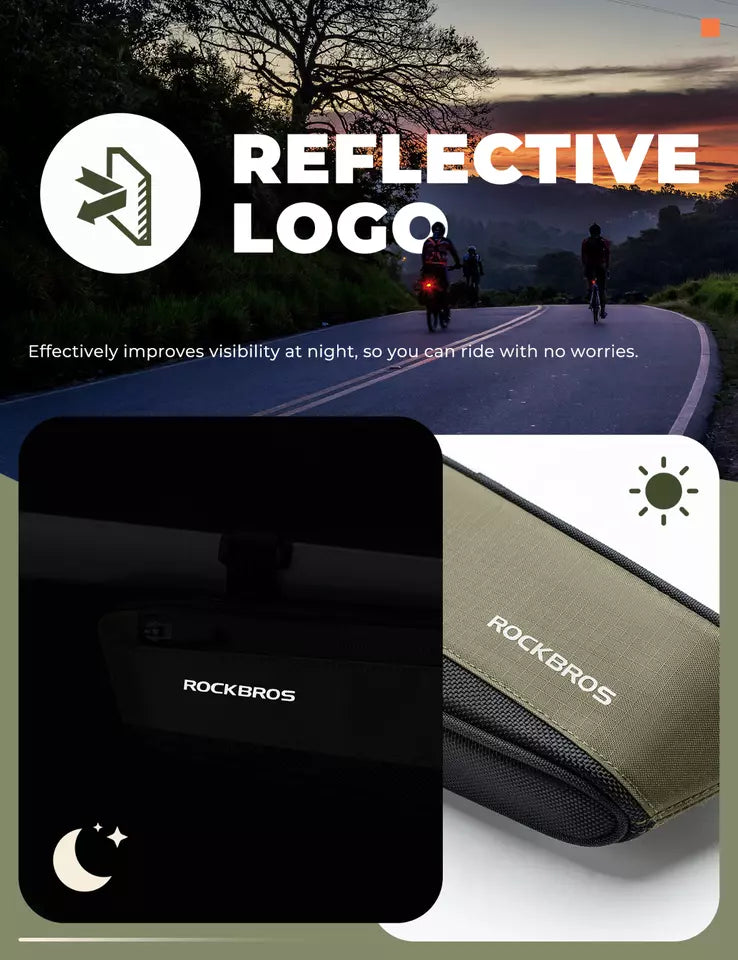 Sisäiset verkkotaskut:ROCKBROS-laukku on varustettu sisäisillä verkkotaskuilla, joiden avulla voit lajitella ja järjestää tavarasi siististi.