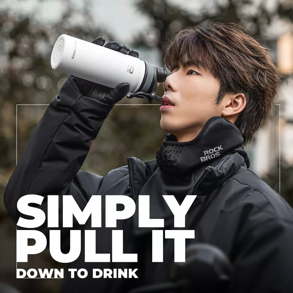 Käytännöllinen ja mukava: kasvonaamion erityinen muotoilu mahdollistaa sen vetämisen vaivattomasti alas ja altistaa suun veden juomalle milloin tahansa ajon aikana.