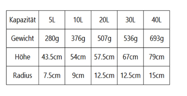 Irrotettavalla hihnalla: 1x hihna 5L:lle. 2x irrotettavat hihnat 10 litralle 20 litralle 30 litralle 40 litralle.